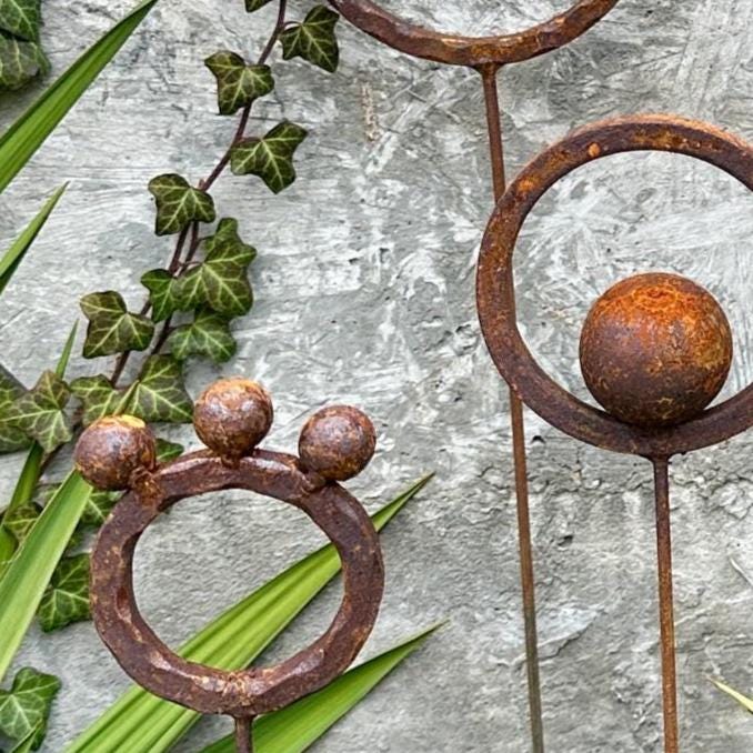 This Rustic metal garden finials set of 8 will place decorative accent in the garden compositions and landscape, create an atmosphere of romance and coziness in your home. This rusty metal art could be used as decoration at your home, in your garden, backyard, terrace or entrance to your home. This yard decor made from natural metal and it covered with a natural rust. This rusty garden decor can be used all year round, it is not afraid of precipitation, direct sunlight, etc.