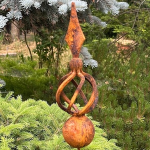 This Rustic metal garden finial will place decorative accent in the garden compositions and landscape, create an atmosphere of romance and coziness in your home. This rusty metal art could be used as decoration at your home, in your garden, backyard, terrace or entrance to your home. This yard decor made from natural metal and it covered with a natural rust. This rusty garden decor can be used all year round, it is not afraid of precipitation, direct sunlight, etc.