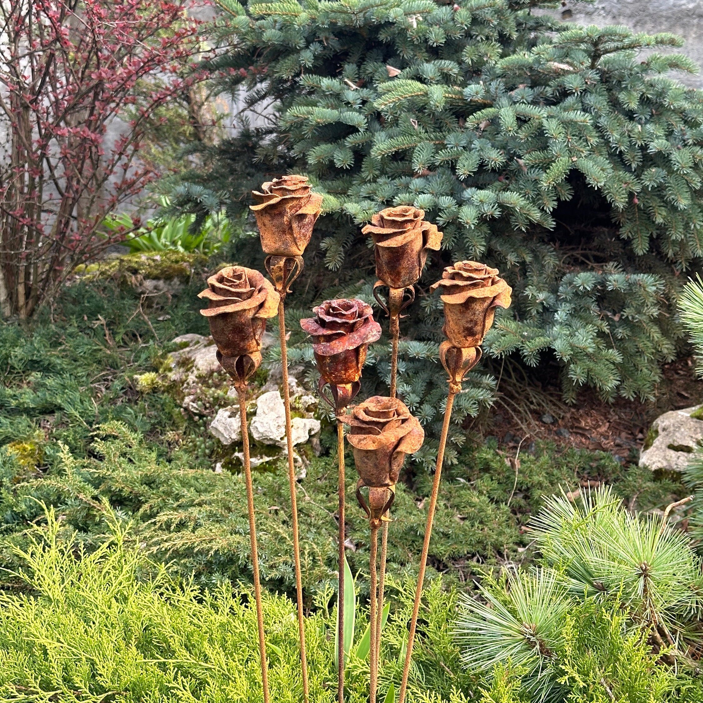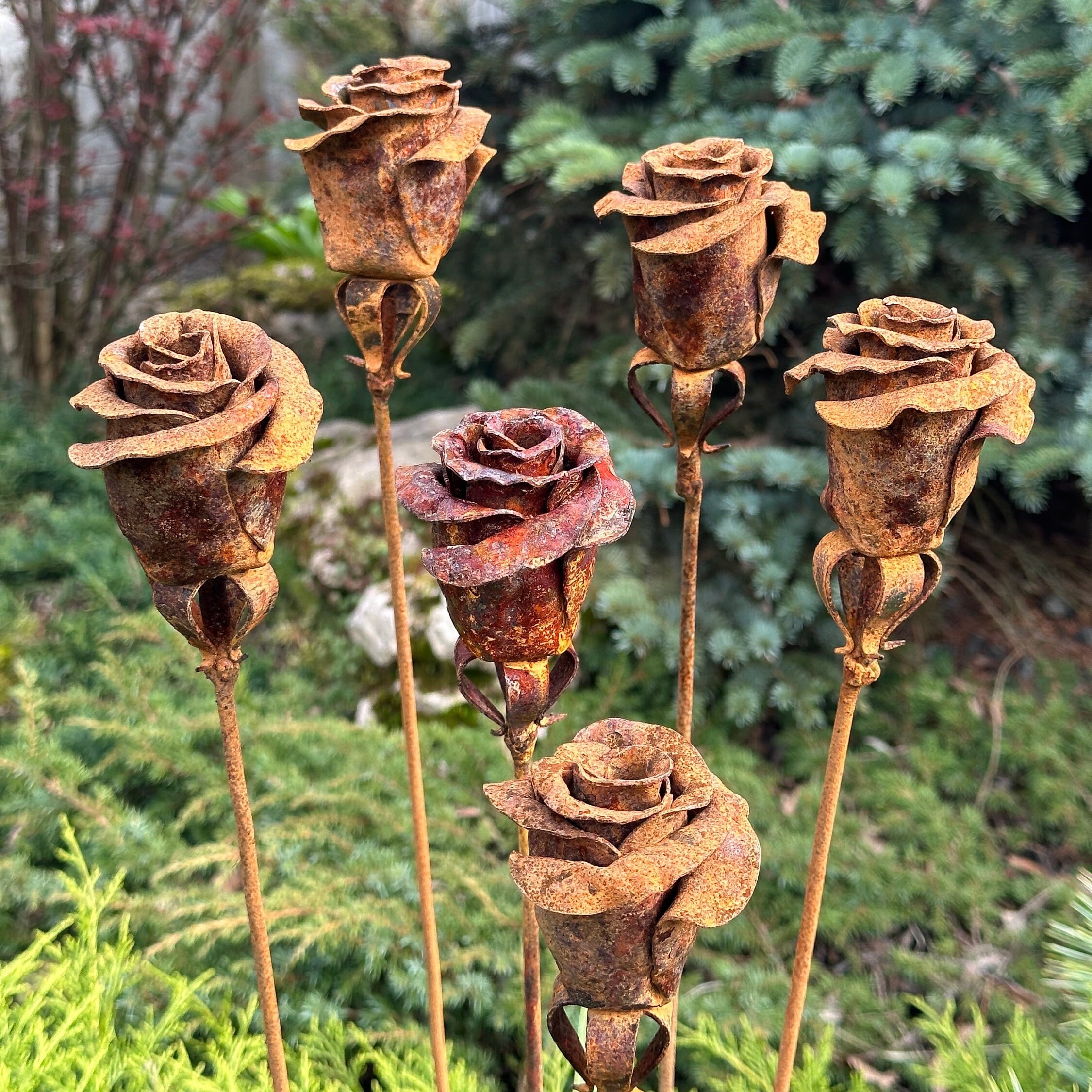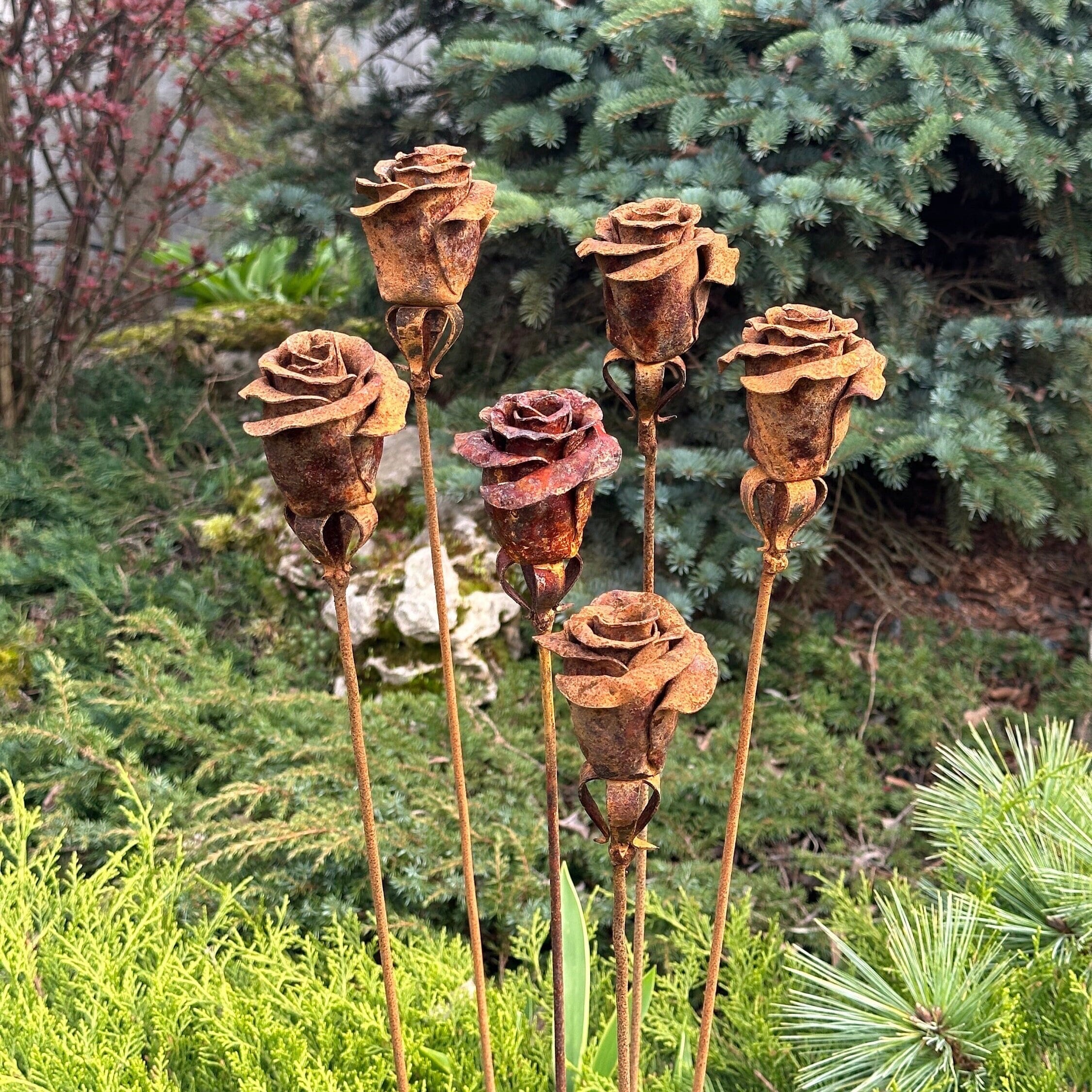 The tall, slender stakes add vertical interest to garden beds, lawns, and borders, while the rose heads create a soft, organic contrast against stone, greenery, and wood. Built for outdoor life, these metal flowers are fully weather-resistant and require no upkeep, making them ideal for year-round display.