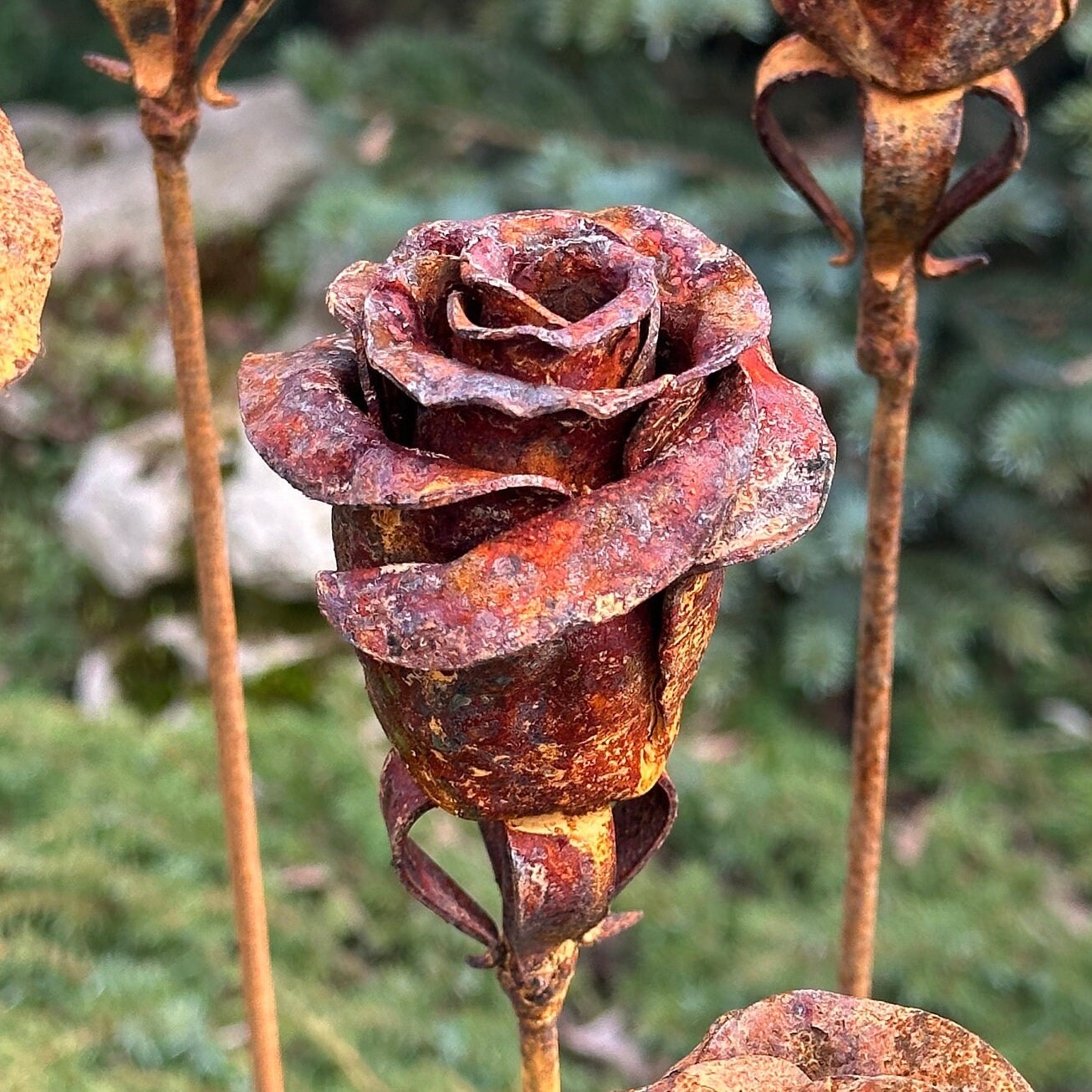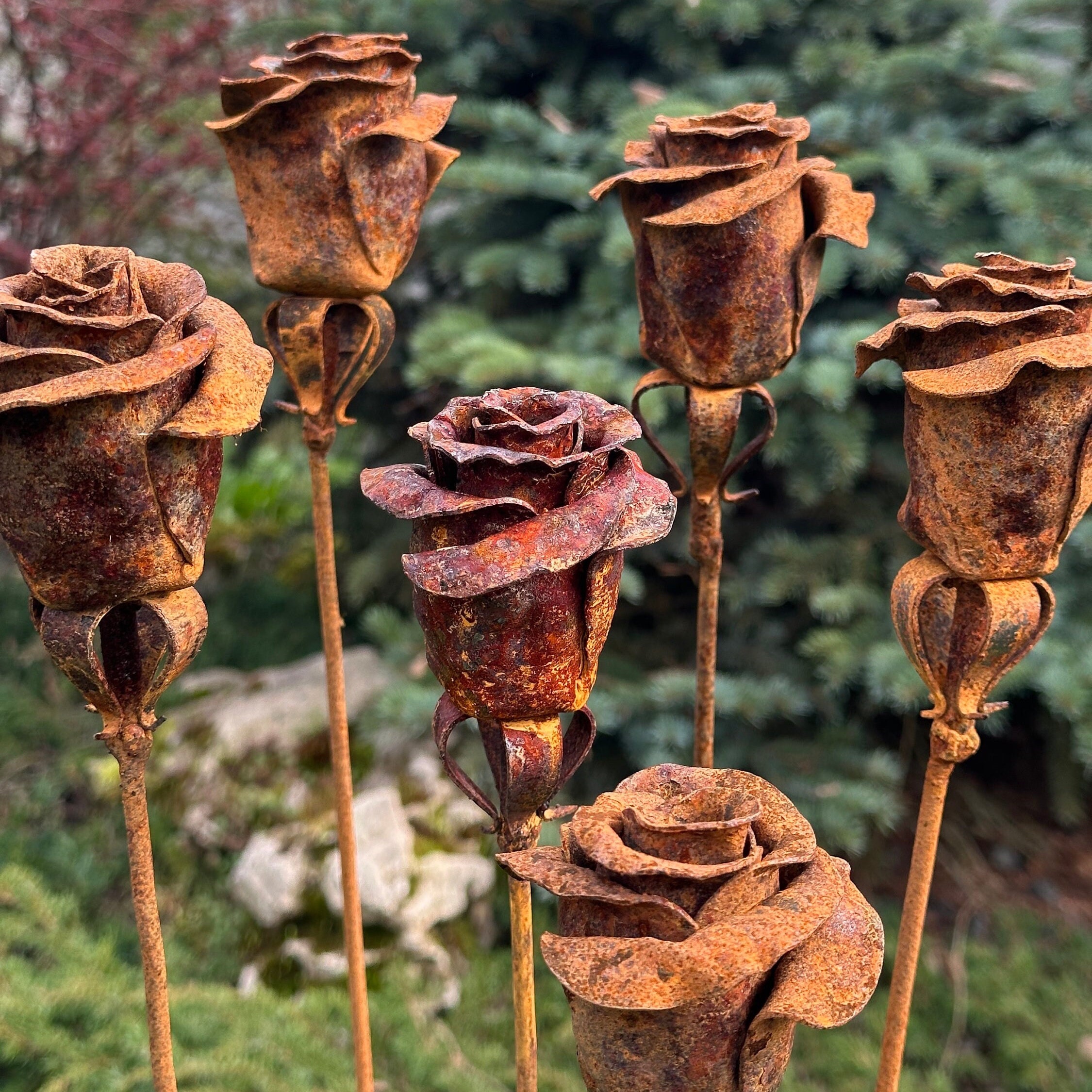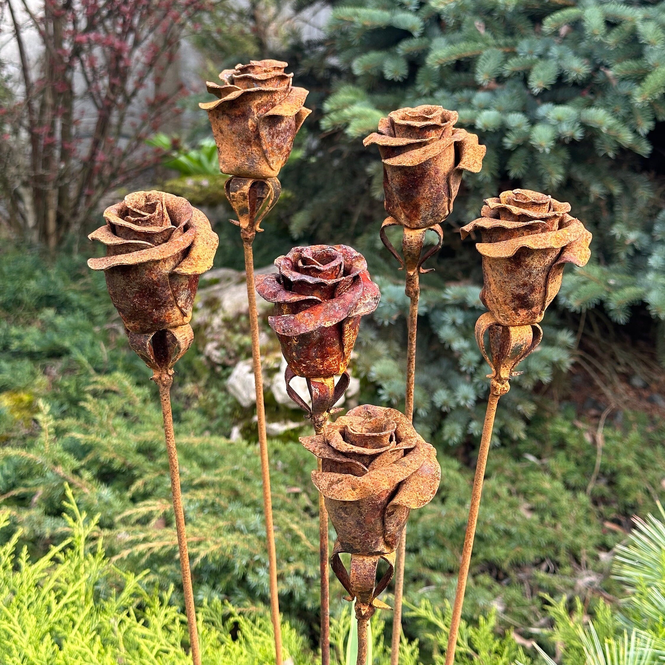 The tall, slender stakes add vertical interest to garden beds, lawns, and borders, while the rose heads create a soft, organic contrast against stone, greenery, and wood. Built for outdoor life, these metal flowers are fully weather-resistant and require no upkeep, making them ideal for year-round display.