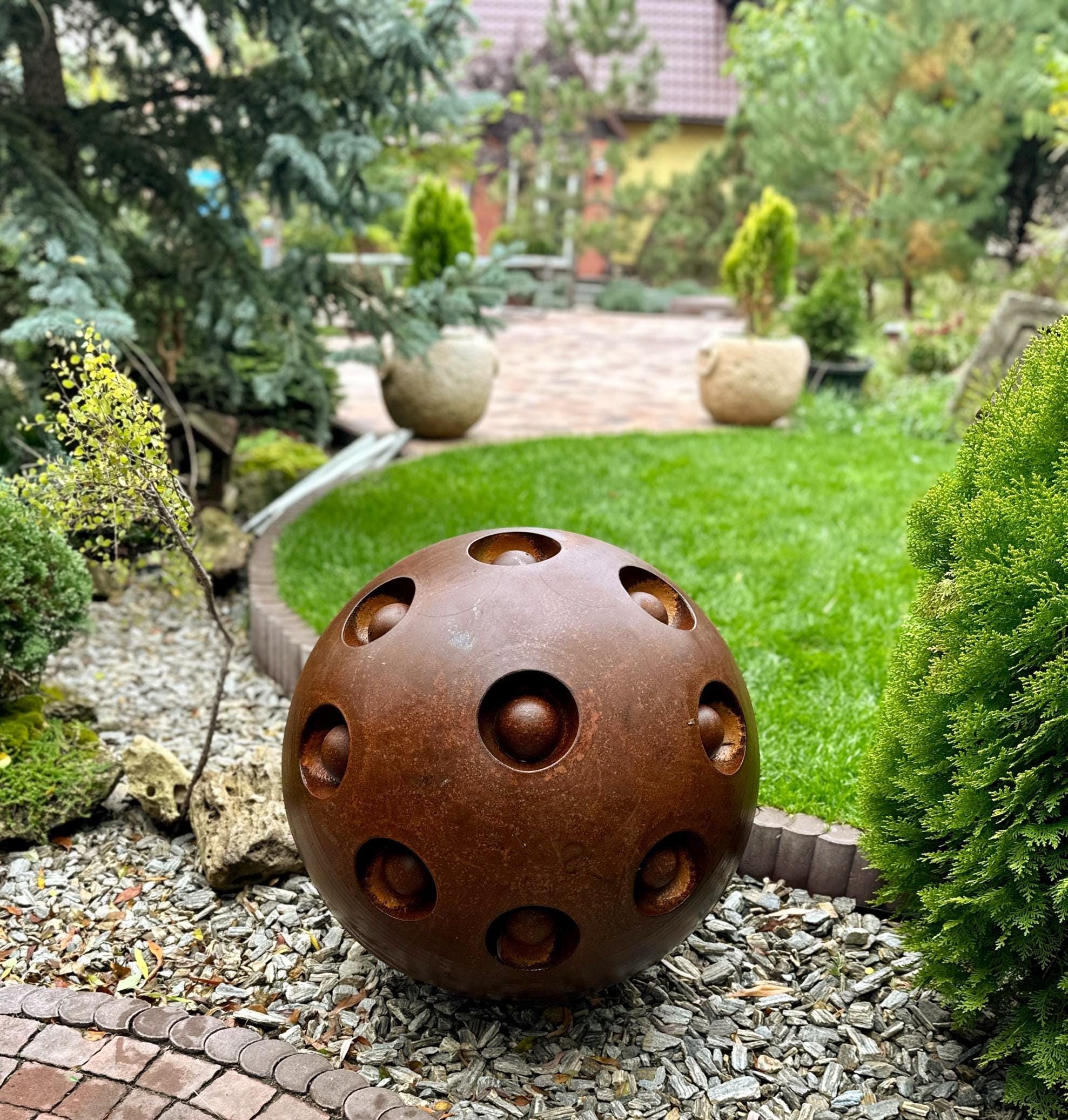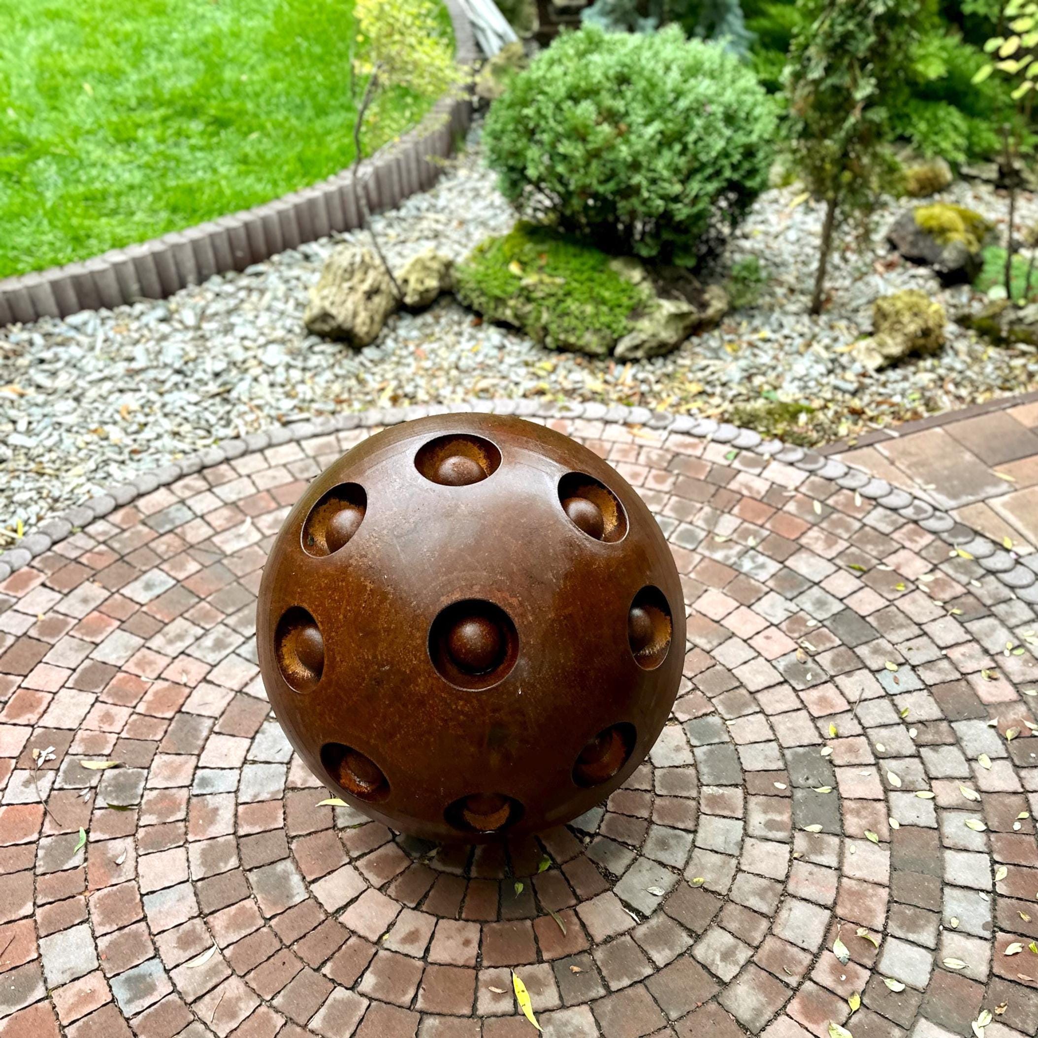 The sphere features intricate openwork details that cast a soft play of light and shadow, creating a sense of calm and harmony—ideal for Zen gardens, patios, or modern outdoor spaces. Its naturally weathered rust finish adds timeless character that blends effortlessly with both classic and contemporary decor.