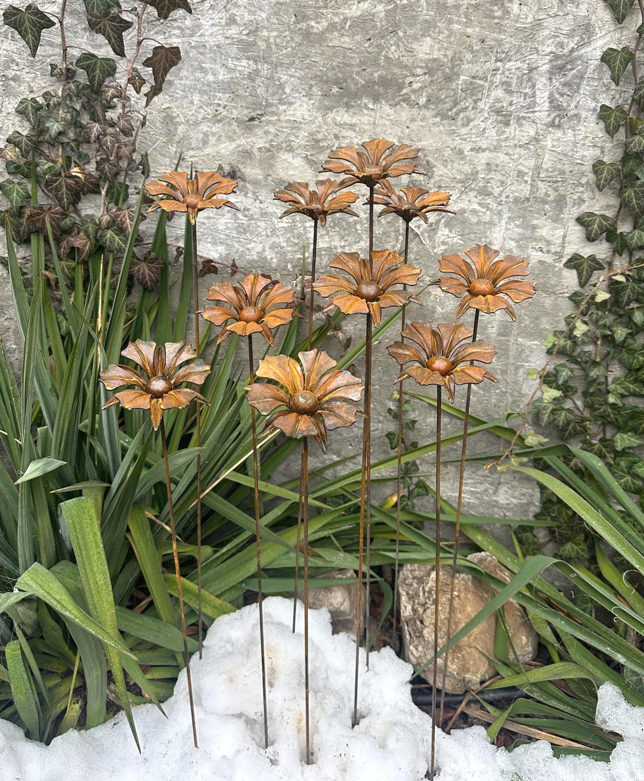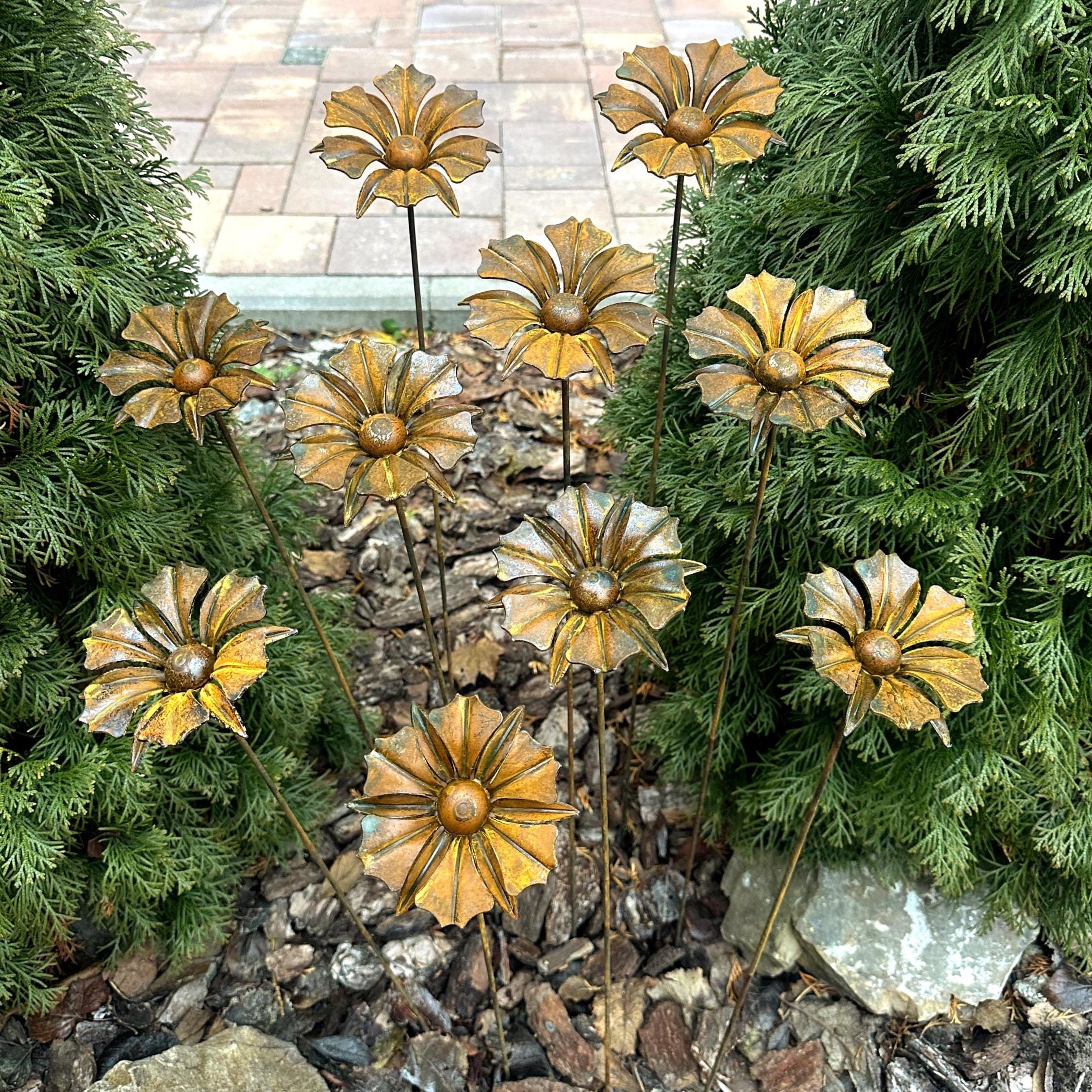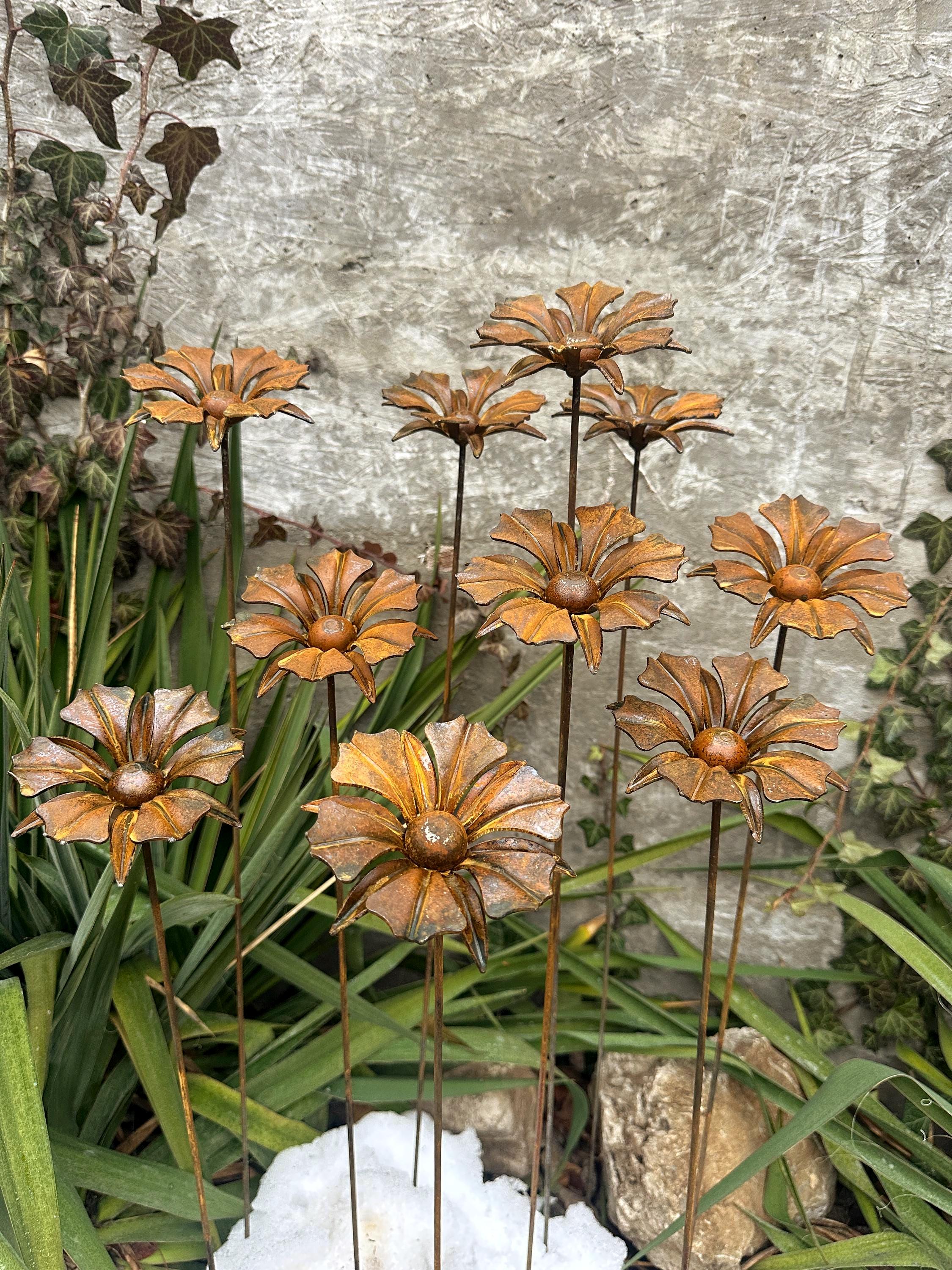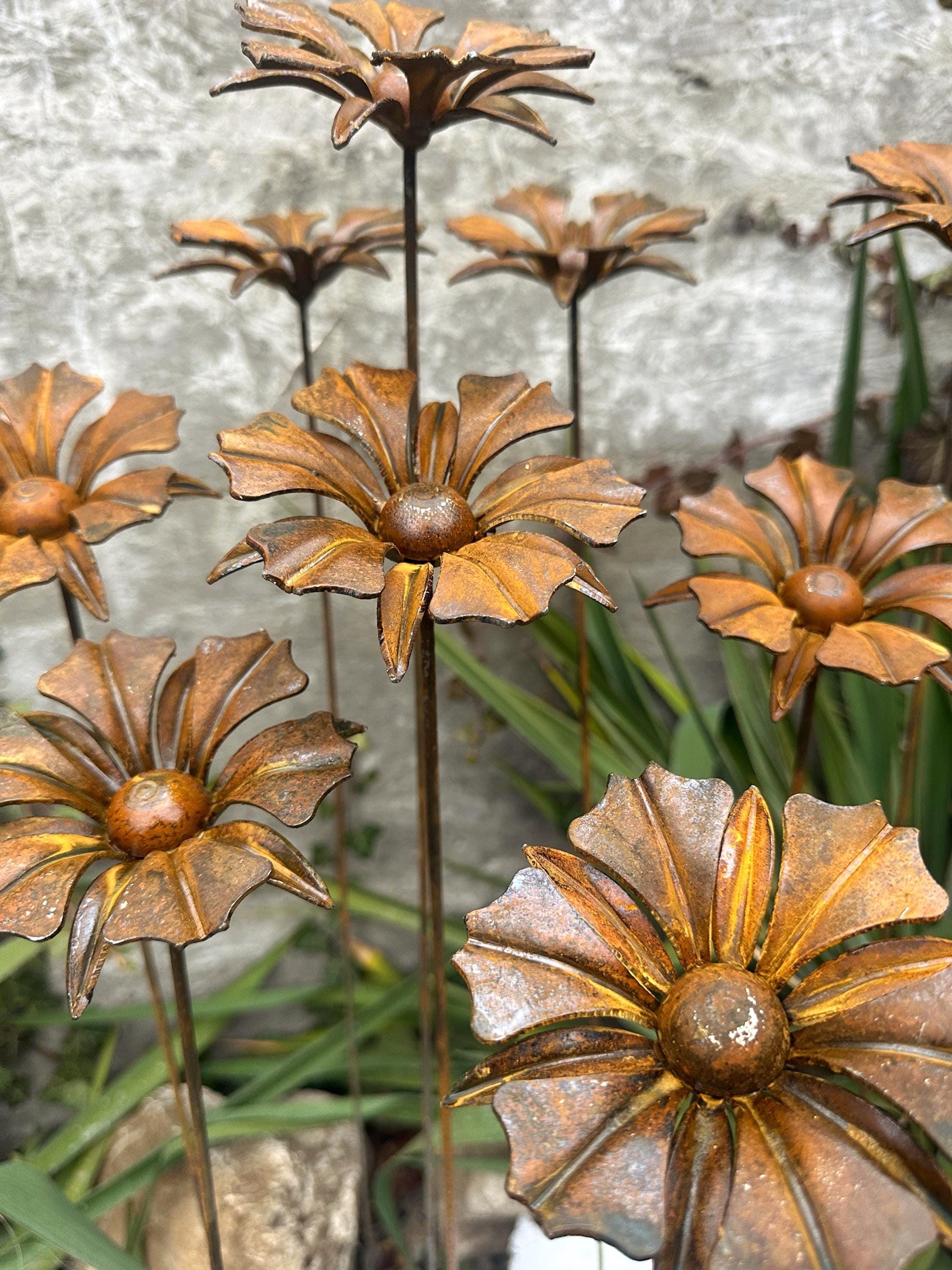 This Rustic handmade metal flowers set of 10 will place decorative accent in the garden compositions and landscape, create an atmosphere of romance and coziness in your home. This rusty metal art could be used as decoration at your home, in your garden, backyard, terrace or entrance to your home. This yard decor made from natural metal and it covered with a natural rust. This rusty garden decor can be used all year round, it is not afraid of precipitation, direct sunlight, etc.