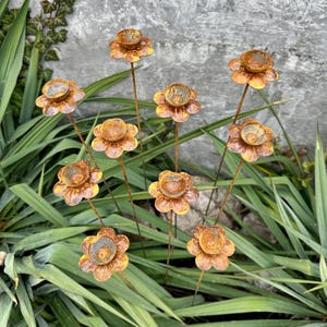 - 20 metal rusty flowers - about 35‘ (90 cm) tall and 3’ (7 cm) in diameter. Each weighs about 0.44 lb (200 g).