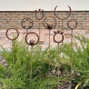 Enhance your outdoor space with this set of 8 handcrafted metal flower sculptures, designed to complement both modern and rustic landscapes. These durable garden stakes feature an elegant weathered patina, adding character to flower beds, pathways, and planters.