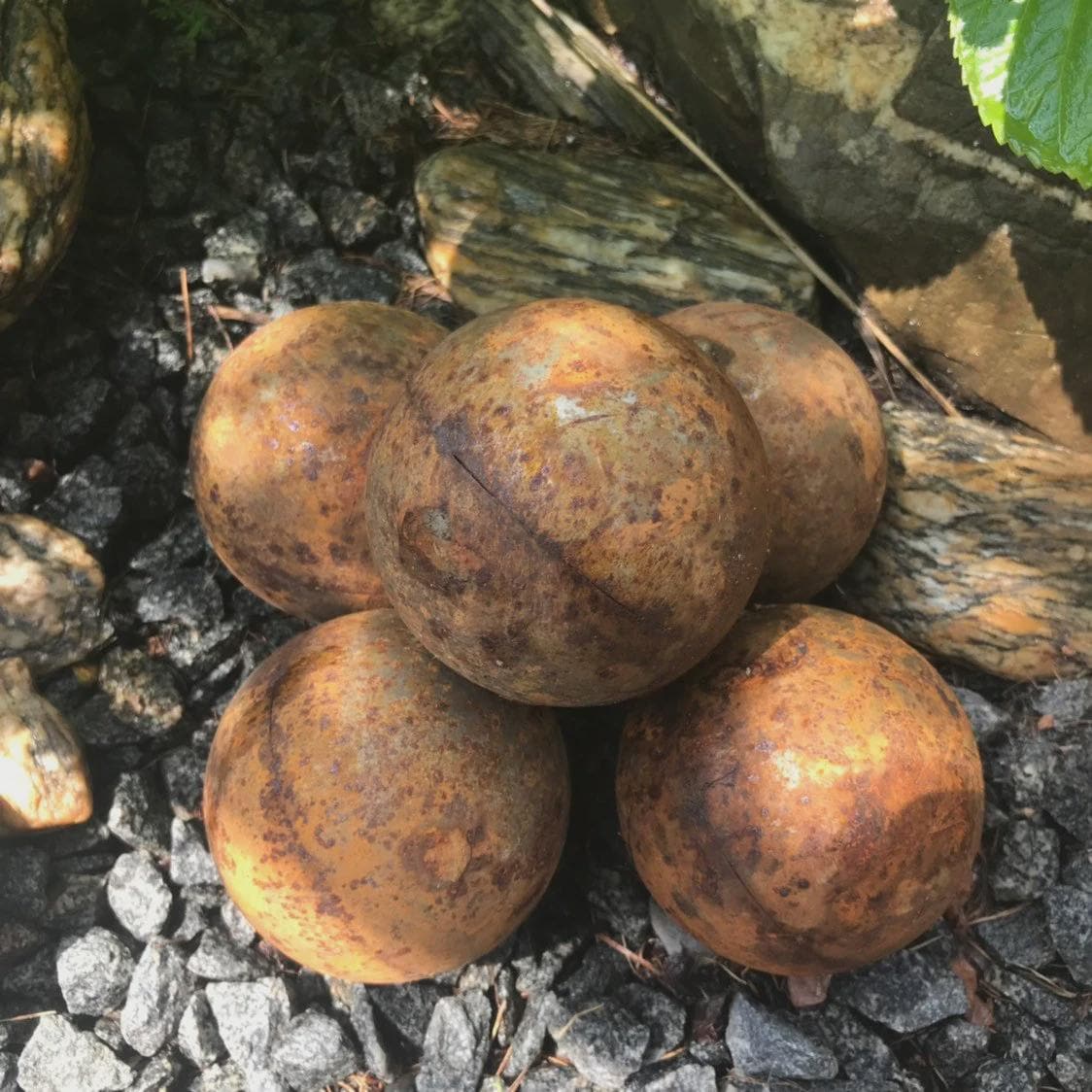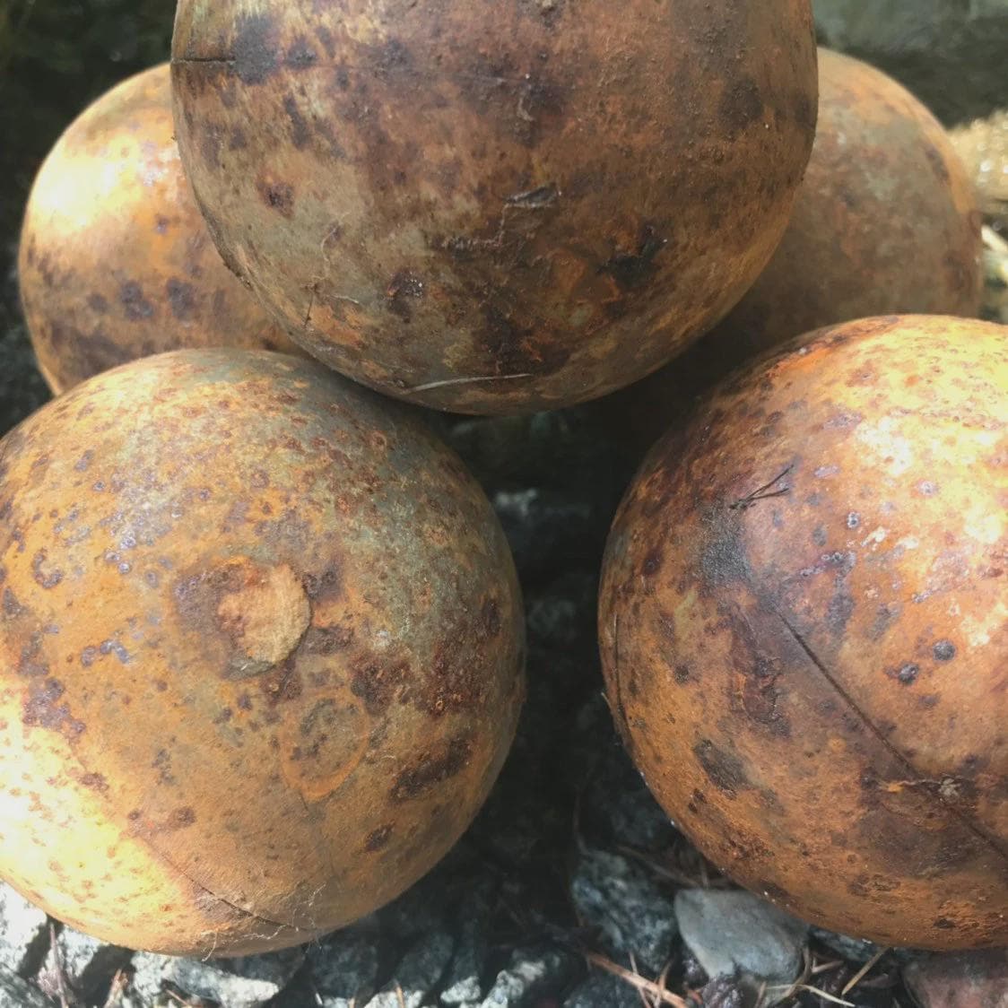 - Five 5” (12 cm) metal rusty balls. Weight is around 0,9 lbs (400 gr) each.
